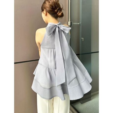 トレンド感溢れるアメリカンスリーブデザインで、大人っぽく上品な印象を演出するノースリーブブラウス。腕周りがすっきりと見え、美しいデコルテラインを引き立てます。身頃はふんわりと広がるティアードデザインを採用し、肩回りを華奢に魅せる効果も。ボウタイリボンは前後どちらでも結ぶことができ、その日のコーディネートに合わせてアレンジ可能です。