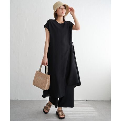 ラップデザインのワンピースとワイドパンツの組み合わせが、力を抜いた大人のスタイルを叶えます。