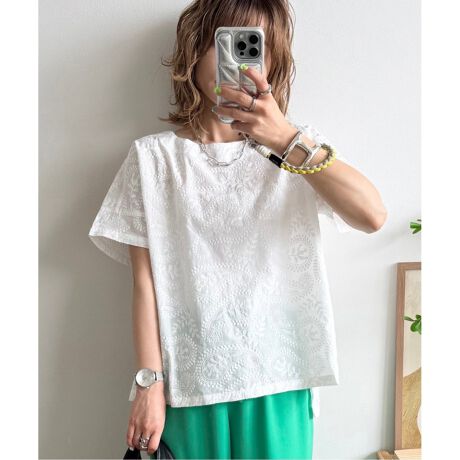 身頃と同色の刺繍のため、遠目には無地のように見えながらも、近くで見るとさりげない立体感が楽しめる一枚です。