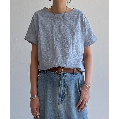 前身頃に総刺繍を施した半袖ブラウス。