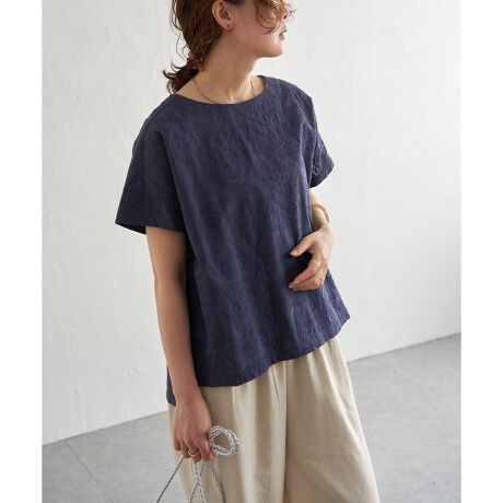 身頃と同色の刺繍のため、遠目には無地のように見えながらも、近くで見るとさりげない立体感が楽しめる一枚です。