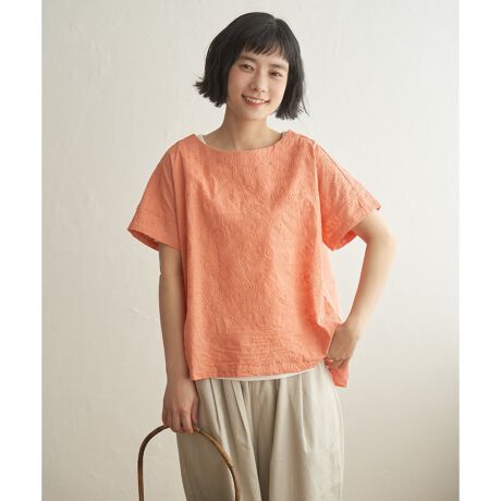 身頃と同色の刺繍のため、遠目には無地のように見えながらも、近くで見るとさりげない立体感が楽しめる一枚です。