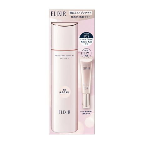 美白*&エイジングケア**。 美白有効成分配合のブライトリフレクト処方で、透明感とハリに満ちた「つや玉」続く肌へ。 薬用美白化粧水。ミニサイズの薬用UV乳液付き。 *メラニンの生成を抑え、シミ・そばかすを防ぎます **年齢に応じたうるおいケア [セット内容] ・エリクシール ブライトニング ローション WT 2 (しっとり) (医薬部外品) 化粧水 170mL ・エリクシール デーケアレボリューション ブライトニング + ba (医薬部外品) 日中用乳液 ミニサイズ 5mL SPF50+・PA++++