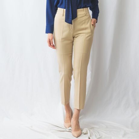 レッグラインを美しく引き立たせるテーパードシルエットのパンツ。センタープレスがきちんと感を加え、縦のラインを強調することで脚を長く見せてくれる効果も期待することができます。ウエストは背面がゴム仕様になっており、フィットする安心感のある穿き心地の良さも魅力。クロップド丈で足元に軽やかなヌケ感を与えてくれます。ミニマルなデザインでシーンを問わずに愛用できるスタイリングの頼れる味方です。