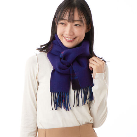 ウールの中でも細くて柔らかくカシミヤの毛質に近いと言われている綿羊絨(めんようじゅう)を使用したマフラーです。表側はチェック柄、裏側は単色のリバーシブル仕様で、気分に合わせてスタイリングを楽しむことができます。ダブルフェイスで肉厚の生地があたたかく首を包み込みます。オーソドックスなスタイルのフリンジマフラーは、巻き方次第で様々なアレンジが楽しめます。