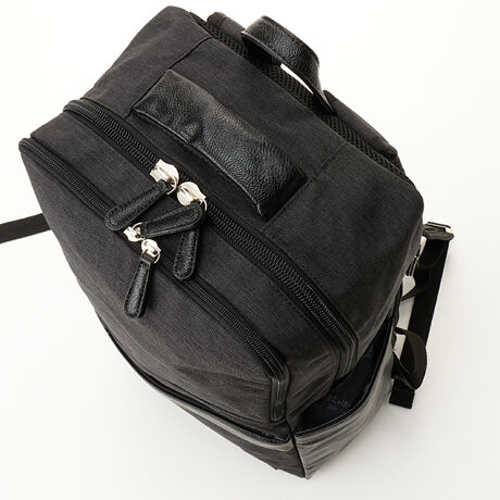 装いを選ばないスクエア型多機能リュックです。 本体素材は杢調ポリエステル/はっ水加工Xシボ合皮の落ち着いた雰囲気です。 収納力抜群で本体前側にファスナーポケット、両サイドには折傘など収納に便利なベタポケットがあります。 メインは整理しやすい2ルームタイプで前側は内装に二分割ベタポケットがあります。 その後側ルームの内装の背面にPC収納ポケット、前側に二分割ベタポケットがあります。 B4収納サイズで通勤・通学と幅広くお使い頂けます。