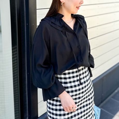 ・衿元のリボンはそのまま垂らして、V開きで着用すると甘くなりすぎずすっきりした印象に
