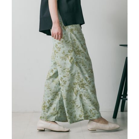 フラワー柄のジャガードが目をひく柄パンツ。サテンの光沢感が春らしさと女性らしさを出してくれて、トップスとの素材のコントラストが出やすいので、