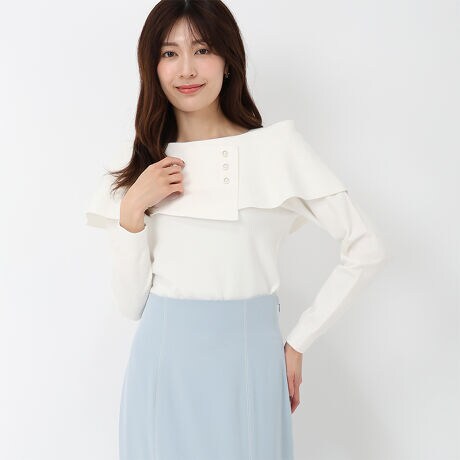アシンメトリーなケープにパールボタンをあしらったニット。ふんわりと重ねたケープが気になる肩周りや二の腕をカバーしつつ、フェミニンな印象を演出してくれます。デートや女子会などにもおすすめの大人可愛いアイテムです。■fabric透け感[無し]裏地[無し]伸縮性[有り]生地の厚さ[普通]