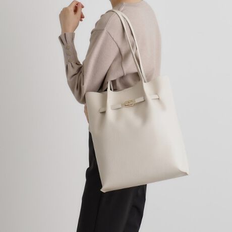 ハンドルのタックとトレンドのベルト金具デザインで、A4サイズが入るトートバッグ。