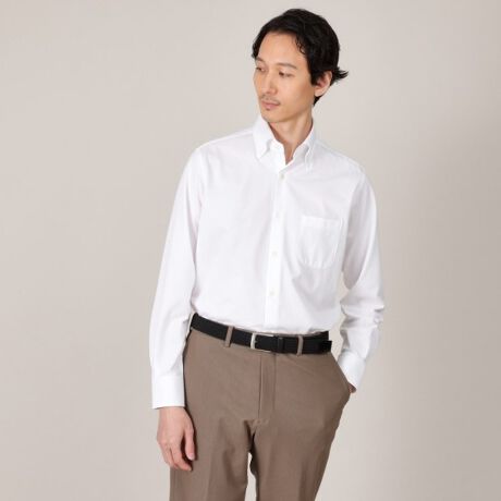 襟はボタンダウンカラーで、シルエットはシャープに見えるシルエットを採用しています。