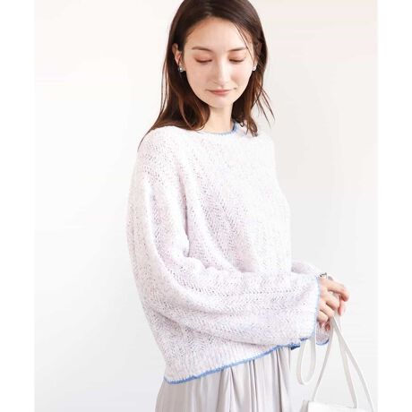 きれいな発色のミックスカラーとブークレーの表面感が目をひくニットプルオーバー。程よい透け感が軽さがあり、衿や裾、袖口の配色使いがデザインポイントに。ゆるっとしたワイドシルエットと短めの丈感がボトムを選ばないバランスで着こなせます。