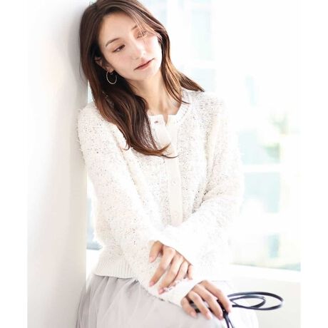 ぱっと見た目が可愛く好印象なツイード調のニットカーディガン。クルーネックのコンパクトな丈感で、普段使いからONシーンまで、一枚羽織って華やかに着映えるカーディガンです。