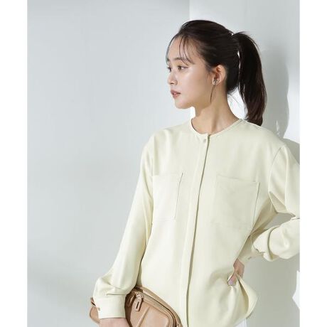 上品さとリラックスムードを兼ね備えたWポケットブラウス。とろみのある上品な素材感ながらも、胸元のフラップポケットが程よくカジュアルな雰囲気を演出。透けの無い少し厚地で綾目のパウダリージョーゼットが、通勤シーンではもちろん、お出かけ着としても重宝します。