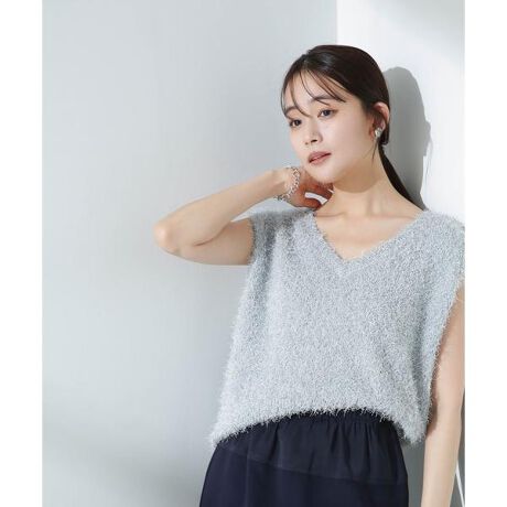 キレイめにもカジュアルにも着こなしやすいレイヤードスタイルの定番ニットベスト。ロングフェザーとロングラメフィルムを組み合わせた毛足感のある素材は、ドライタッチなのでシーズンレスで活躍してくれます。