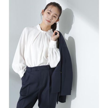 ・スタンドカラーとタック入りのボウタイディティールがきれいめな印象のブラウス