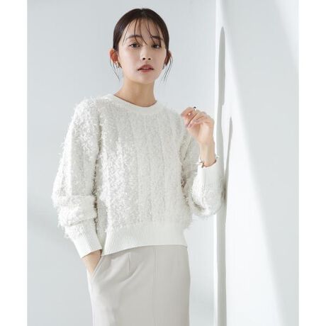 チュールのフサフサした表情が華やかでコーデのポイントとなるニットプルオーバー。冬素材にマンネリ化してきた時期に表情や素材感で新鮮に着られるアイテム。ゆるっとした幅感と短めの着丈が、ワイドパンツやデニムと合わせて春を感じる雰囲気を演出してくれる一枚です。