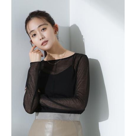 ほんのり素肌が透けるシアートップス。寒い時期には、ニットやカーディガンとのレイヤードスタイルにも活躍する一枚。手首をクシュっとさせることで華奢さを演出するスタイリングをご提案します。