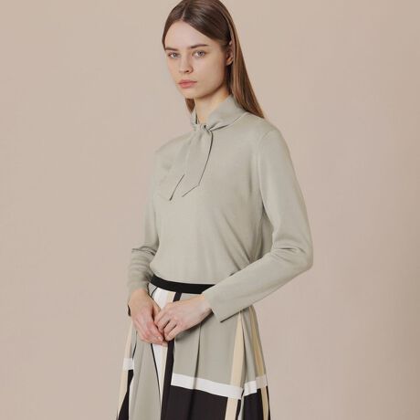 ボウタイ付きニットプルオーバーです。ボウタイは取り外し可能で、ベーシックなハイネックとしても、また、スカーフ(品番:G5771460)を通してカラーコーディネートしたり、お手持ちのスカーフを通しアレンジして着用することもでき、様々な着方が楽しめます。同素材のニット(品番:G5N10401)もご用意しております。