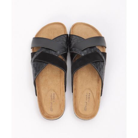 上質なレザータッチ、スエードタッチ、そして編み込みと異なる3つの素材がクロスしたサンダル。