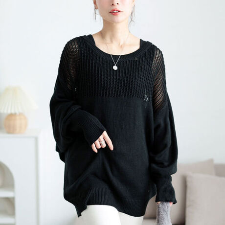 さりげない切り替えがコーディネートのアクセントになるメッシュ切り替えドルマンニットの登場です♪ドルマンシルエットでゆったりと体型を拾わずリラクシーな着心地です。編み目を変えた切り替えデザインがさりげないオシャレな印象に◎デコルテの透け感でコーデに女性らしさをプラス☆バランスの良い着丈でどんなアイテムとも相性◎幅広い年齢の方にオススメの1枚です!