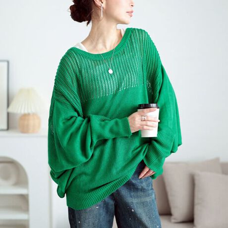 さりげない切り替えがコーディネートのアクセントになるメッシュ切り替えドルマンニットの登場です♪ドルマンシルエットでゆったりと体型を拾わずリラクシーな着心地です。編み目を変えた切り替えデザインがさりげないオシャレな印象に◎デコルテの透け感でコーデに女性らしさをプラス☆バランスの良い着丈でどんなアイテムとも相性◎幅広い年齢の方にオススメの1枚です!