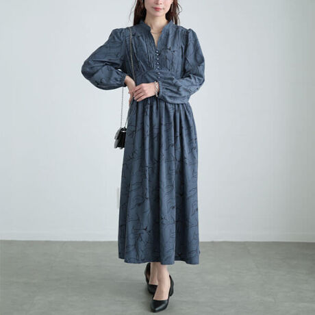 【大きいサイズ】 ウエスト切り替えピンタック花柄ワンピース 大きいサイズ レディース ワンピース 冬