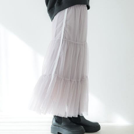 動きのあるチュール素材が軽やかさを演出し、カジュアルからきれいめまで幅広く対応可能。