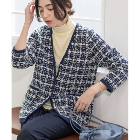 ・華やかなツイード調編地がポイントのニットカーディガン