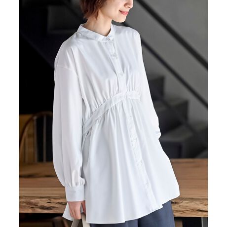 上品なバンドカラーが女性らしいスタイリングを演出します。