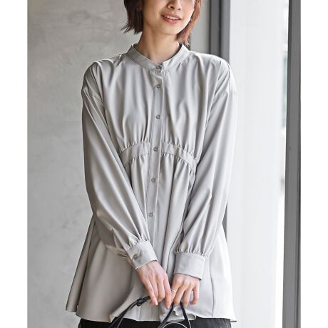上品なバンドカラーが女性らしいスタイリングを演出します。