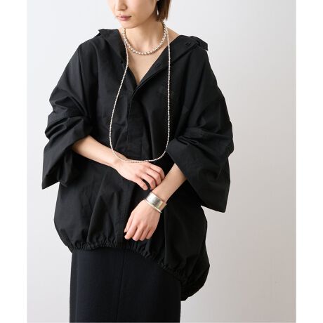 エポレットを装備しフロントボタンは深めの比翼仕様、小ぶりの襟は立てても様になるバランスで、裾回りはゴムギャザー仕様で全体のバルーンシルエットを引き締めています。
