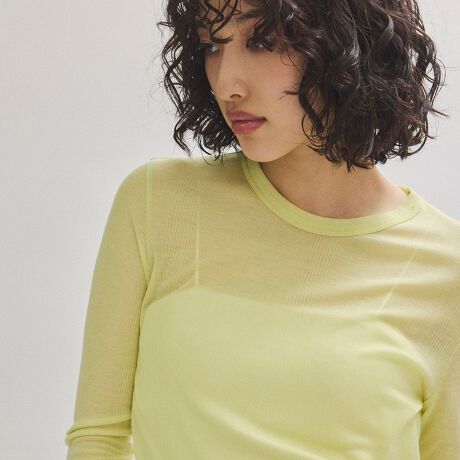 やや薄手で、フライスハリヌキ生地で透け過ぎない上品なシアー感はインナーにプラスするだけでこなれた印象に。