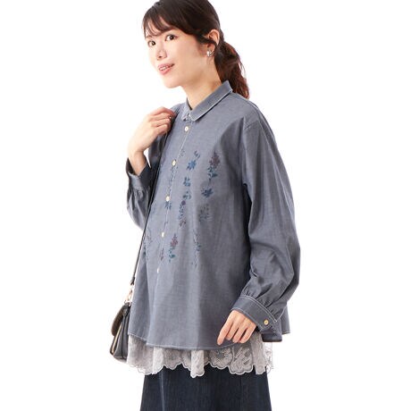 コットンポリエステルシャンブレーフラワーストライプモチーフプリント+サイドレースシャツブラウス