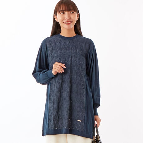 シュリンクさせたチューリップレースをハイゲージニットとドッキングしたチュニック。