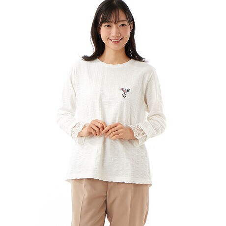 ストライプジャカードフラワーワンポイント刺繍カットソー
