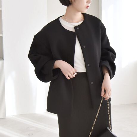 パフっとしたボリューム感のある袖がポイントのノーカラーコート。