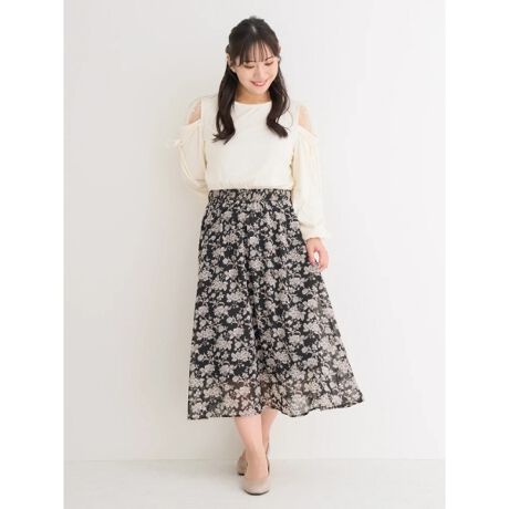 ほんのりとした肌見せバランスやフレアに広がるスカートシルエットが、フェミニンさを高めてくれます。