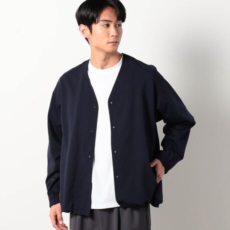 素材の特性を活かしたカーディガンのような羽織れてインナーにも使える要素を入れたブルゾン。フロントをスナップ釦にする事で軽さと開け閉めをしやすくしています。