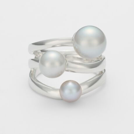 3連のパール(真珠)リングを重ね着けしているようなデザインで、ラグジュアリー感あふれるリング。サイズの異なる3粒のパール(真珠)とリングの曲線が、絶妙な立体感でボリュームがありながらも軽やかな印象を与えます。手元に華やかさを与えてくれるアイテムです。※天然石や天然素材を使用しているものは、サイズ・色味・風合いの違いや、若干の傷、内包物の有無などに個体差があります。予めご了承ください。※石は、のり留め(芯立て)ですので水分にはご注意下さい。※サイズ直し不可。