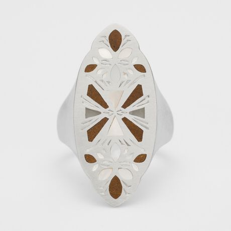 砂で描かれた樹からインスパイヤされたリング。ヌードベージュの「砂」を基調に、3種類の天然石をさまざまな形にカットしてデザインしています。天然石の周りには繊細な彫り模様が施され、立体感と奥行きを感じさせます。ボリュームがありながらも、柔らかな曲線を描くことで、エレガントで洗練された印象を与えています。※天然石や天然素材を使用しているものは、サイズ・色味・風合いの違いや、若干の傷、内包物の有無などに個体差があります。予めご了承ください。※サイズ直し不可。