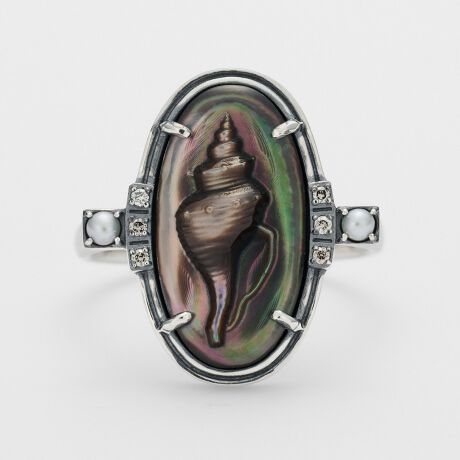 オリジナルで作製した貝モチーフのシェルカメオを使用した、モダンデザインのリング。シックな表情に、海の泡をイメージしたダイヤモンドとパールの輝きが落ち着いた印象を与えます。石座背面は波をイメージした透かしデザインが施され、細部まで凝ったつくりも魅力の一つです。※天然石や天然素材を使用しているものは、サイズ・色味・風合いの違いや、若干の傷、内包物の有無などに個体差があります。予めご了承ください。※パールは、のり留め(芯立て)ですので水分にはご注意下さい※サイズ直し不可。