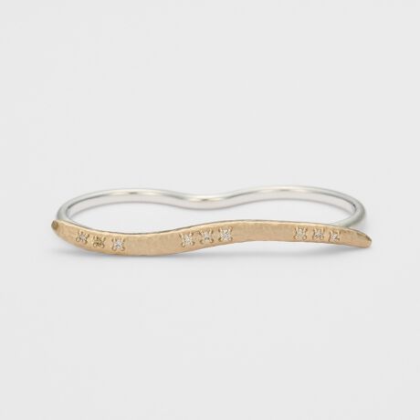 砂の上を指でなぞったような、曖昧で儚い一瞬を切り取るようにデザインされたリング。ニュアンスのあるラインとマットなテクスチャー、ラフにセットされたダイヤモンドの輝きが、上品な煌めきを演出します。シルバーとゴールドのコンビ素材は、他のジュエリーとも合わせやすく、コーディネートの幅を広げてくれます。2本の指を通すダブルフィンガーリングは、一気に手元のモード感を高めてくれるアイテムです。トレンドアイテムながら、アガットらしく繊細な着けこなしが叶います。※天然石や天然素材を使用しているものは、サイズ・色味・風合いの違いや、若干の傷、内包物の有無などに個体差があります。予めご了承ください。※サイズ直し不可。