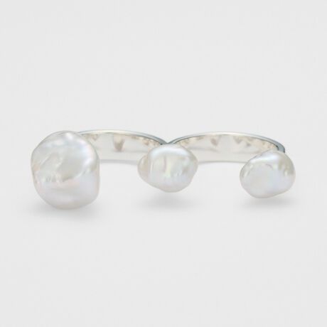 個性豊かな形と艶感が魅力的なパール(真珠)を使用したダブルフィンガーリング。サイズの異なるパール(真珠)が指に浮かんでいるように見える新鮮なシルエットがポイントです。2本の指を通すダブルフィンガーリングは、一気に手元のモード感を高めてくれるアイテムです。※天然石や天然素材を使用しているものは、サイズ・色味・風合いの違いや、若干の傷、内包物の有無などに個体差があります。予めご了承ください。※石は、のり留め(芯立て)ですので水分にはご注意下さい。※リングのサイズは2連とも同じサイズです。※サイズ直し不可。【お取扱い上のご注意】・こちらの製品はデザインの特性上、ご着用いただく指によっては違和感を感じたり、指が動かしづらいといった不便さを感じる可能性がございます。また、着用の際には以下の内容に十分ご注意ください。・重いものを持ったり、過度な力で手を握るなどの行為は変形や破損の原因となります。・ご着用いただく指のサイズによってはリング同士の重なり合いによって石割れやリング自体を傷つけてしまう可能性もございます。