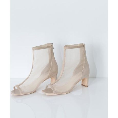 チュール素材がエッジーな雰囲気のオープントゥブーツは、ヌーディーな透け感とスウェードのパイピングが足元に程よい軽さを出してくれる一足。大きく開くバックファスナーで着脱が楽にできます。季節の先取りを叶えてくれるシアーブーツは、春先から秋口まで長く活躍します。【センチ】S:約22.5cm、M:約23.5cm、L:約24.5cm※モデルの着用画像の場合、光の当たり具合により、実際の色味と異なって見えることがございます。色味は、商品単体の画像をご参照ください。