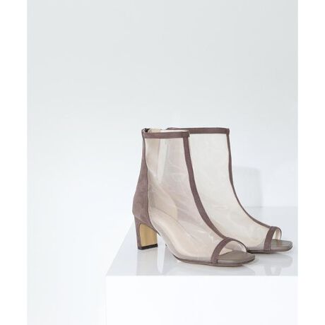 チュール素材がエッジーな雰囲気のオープントゥブーツは、ヌーディーな透け感とスウェードのパイピングが足元に程よい軽さを出してくれる一足。大きく開くバックファスナーで着脱が楽にできます。季節の先取りを叶えてくれるシアーブーツは、春先から秋口まで長く活躍します。【センチ】S:約22.5cm、M:約23.5cm、L:約24.5cm※モデルの着用画像の場合、光の当たり具合により、実際の色味と異なって見えることがございます。色味は、商品単体の画像をご参照ください。