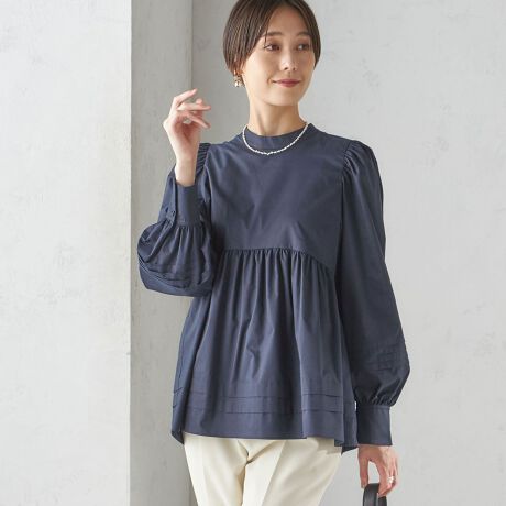 肩のラインをコンパクトにし、ギャザーが入ったボリュームスリーブ、バスト下から切り替えたペプラムデザインがフェミニンな印象です。
