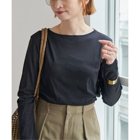 やや長めの袖丈、体のラインを拾わないサイズ感、鎖骨がきれいに見えるボートネックデザインです。