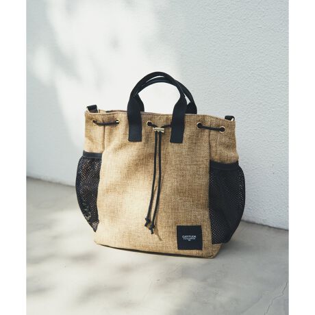 ポリエステルジュート生地にメッシュ素材のポケットが付いた、さり気ないスポーティーさのある2WAYバッグ。