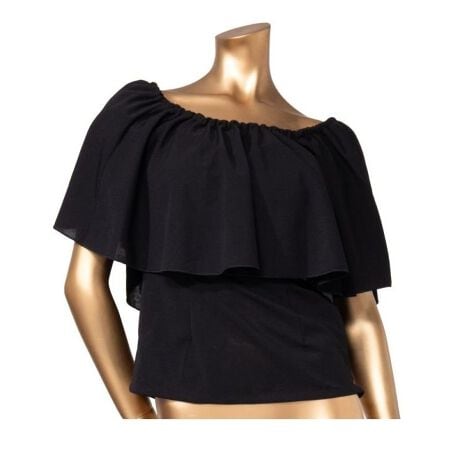 [型番:Y2K-5103-2024]ワイドなフリルカラーが目を惹くステージ用ブラウス。ストレッチ性のあるアムンゼン調の生地を使用し、上品さと動きやすさを兼ね備えています。背面シャーリングと脇ファスナーで着脱しやすいデザイン。襟周りには調整ゴムがありお好みでしぼりの調節が可能です。背面に向って幅が広がるフリルは優雅に揺れ、観る人の記憶に残るステージを演出します。